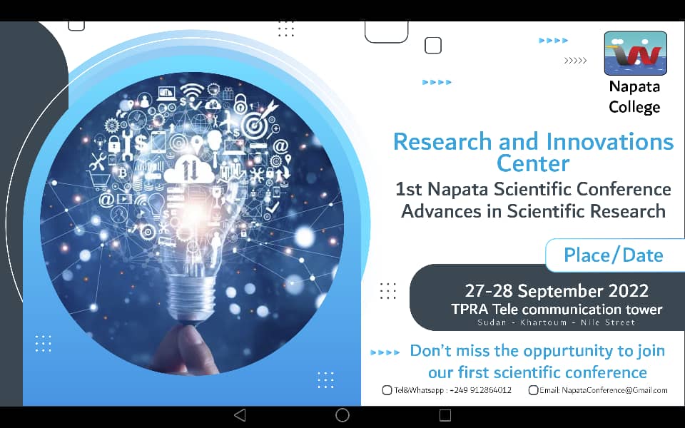 Napata college 1st Scientific Conference “Advances in Scientific Research” Plenary sessions Role of private sector in renaissance of higher education. SEFA for prevention and management of NCDs. Climatic change, water resources management and community resistance of flood risks. Family studies for the maintenance of Sudanese family cohesion. Conference Themes Biotechnology in medical research. Impact of Nutrition on Health Computer…